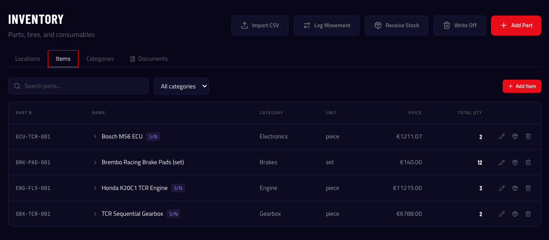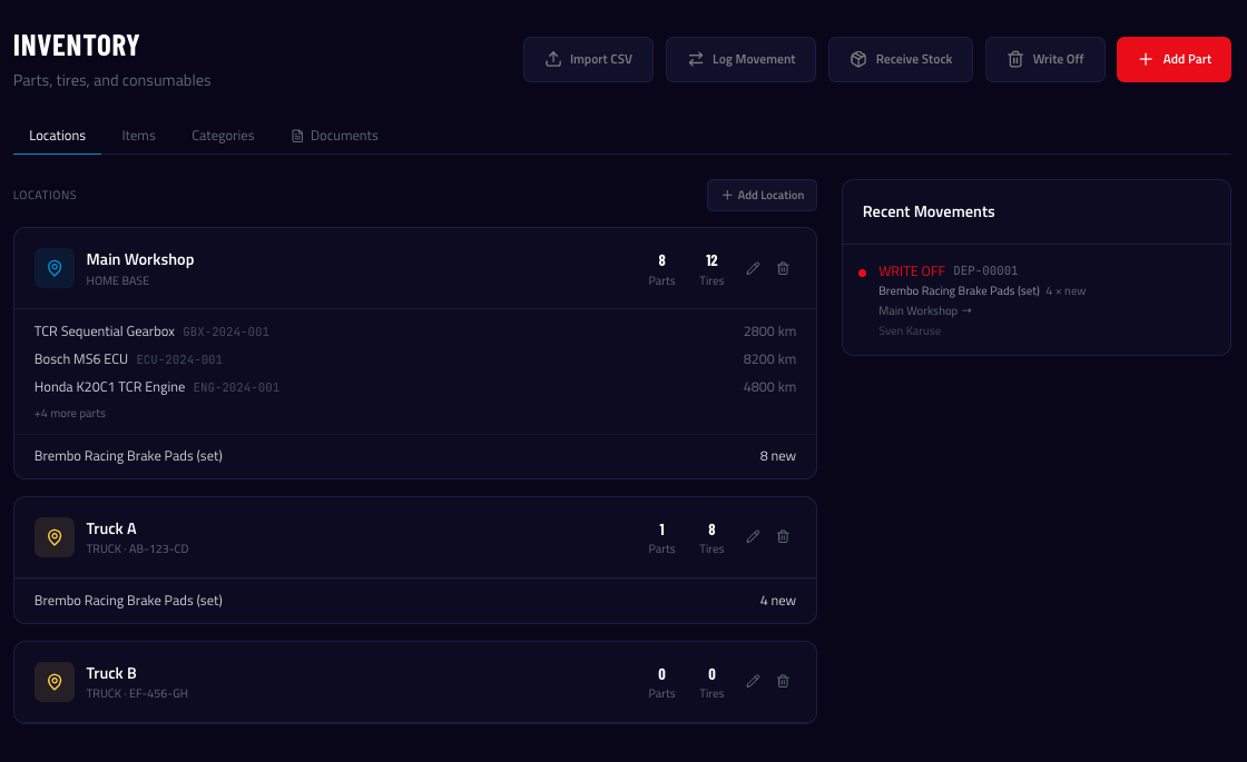 Track where everything is — home base workshop, race truck, or installed on a specific car. Each car and truck is automatically an inventory location.