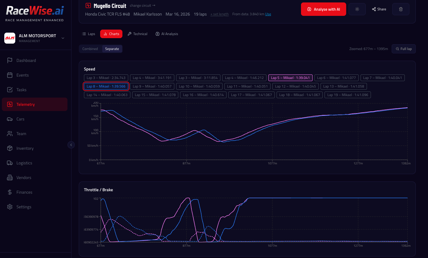 Upload telemetry files directly from your data logger — MoTeC .ld binary files, CSV exports, VBOX, or RaceChrono. Interactive charts with multi-lap overlay, technical monitoring, and AI-powered driving coaching.