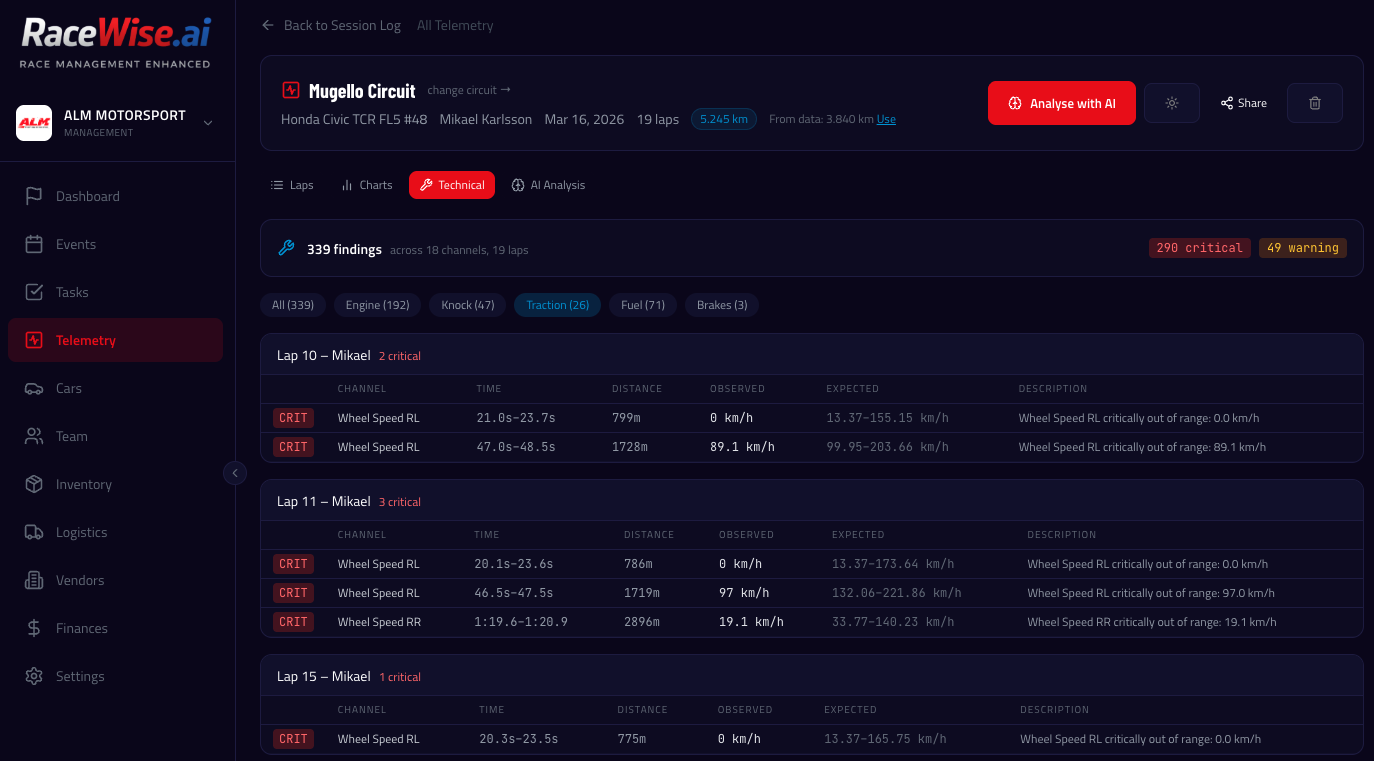 Automated detection of engine and mechanical anomalies using racing-calibrated thresholds. Oil pressure, temperatures, fuel system, boost, lambda, knock, wheel speed divergence, and battery voltage.